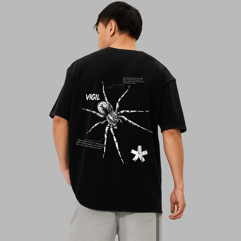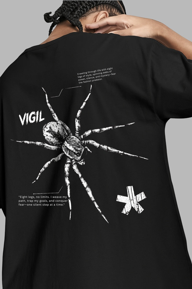 "VIGIL" Black Oversized T-Shirt with Spider Graphic | Gothic Streetwear - Clophic Trend